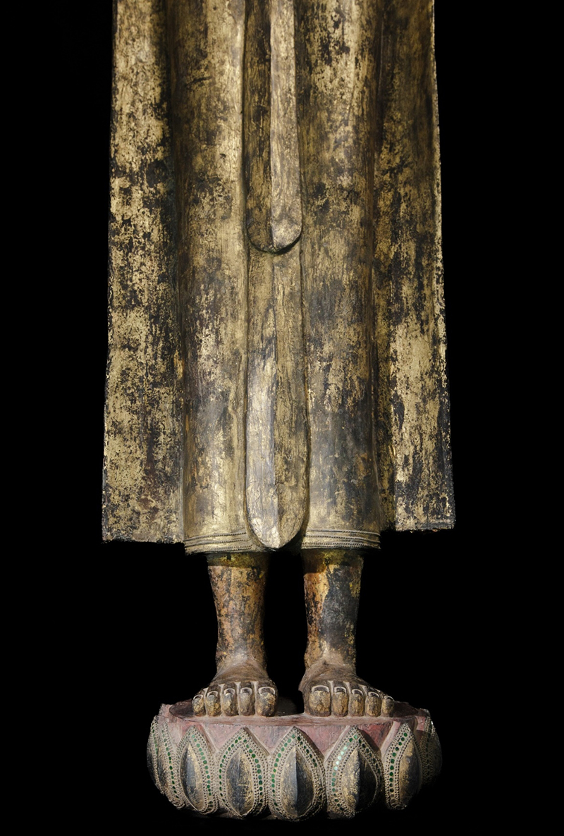 DESCRIPTION: Standing on a double lotus base with feet slightly apart, the right hand raised in Abhaya mudra and the right carrying an alms bowl,