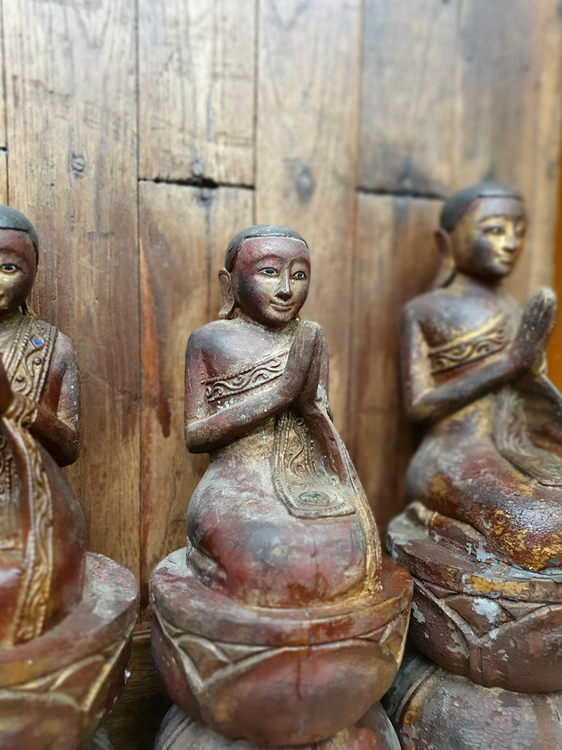 Buddhist monk/s usually found in pairs and placed either side of a central Buddha