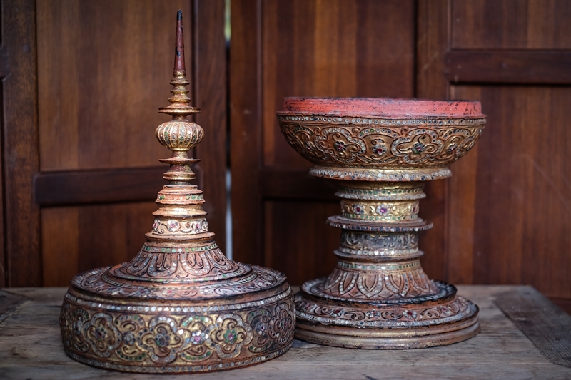 CAT NO.CH254 20C Burmese Lacquer Ware. #CH254 Burmese lacquer ware item used for display or storage (usually of betel nut paraphernalia) and featuring decorative motifs from Burmese myths