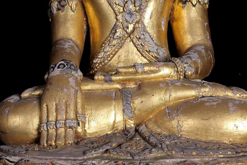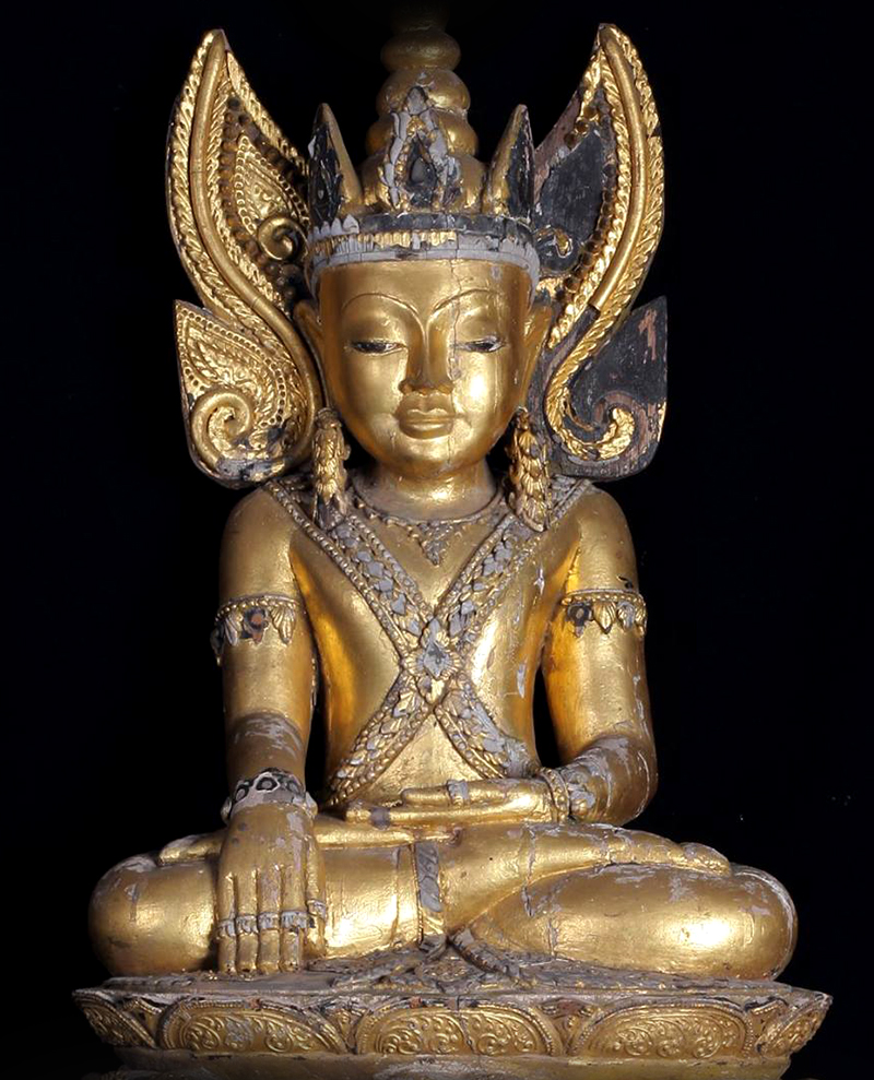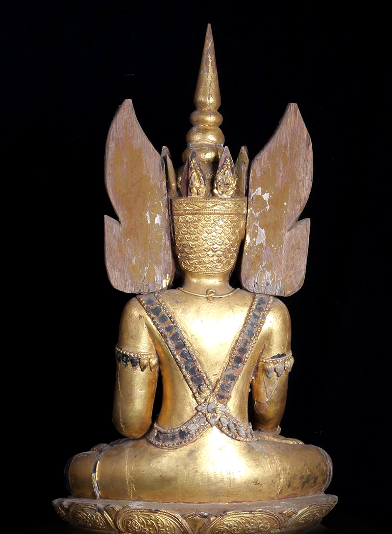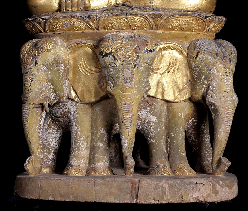 The Buddha is seated on a scalloped lotus leaf that resets on a magnificent throne formed by the broad shoulders of a trio of caparisoned elephants (gajasana).