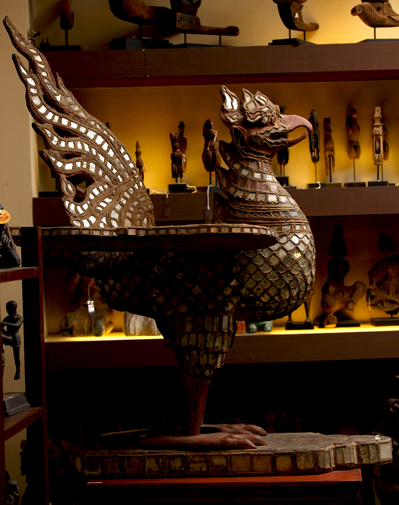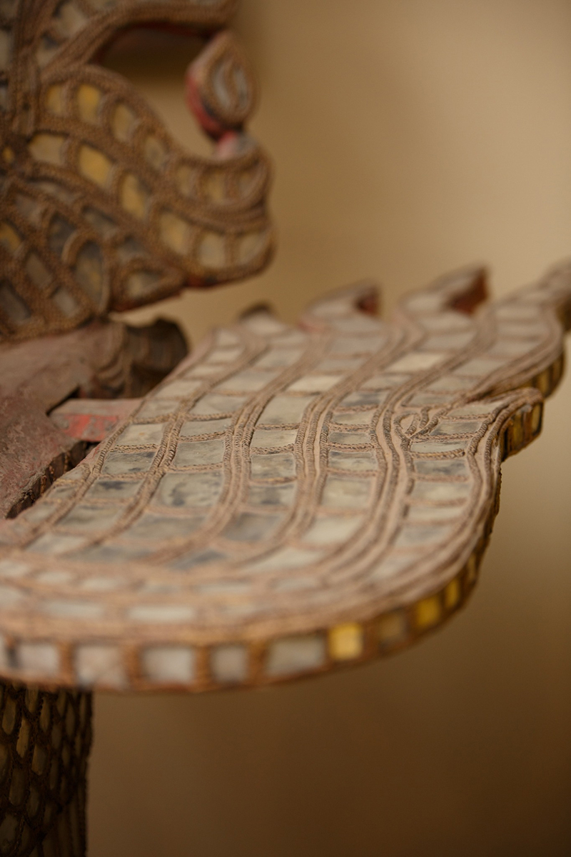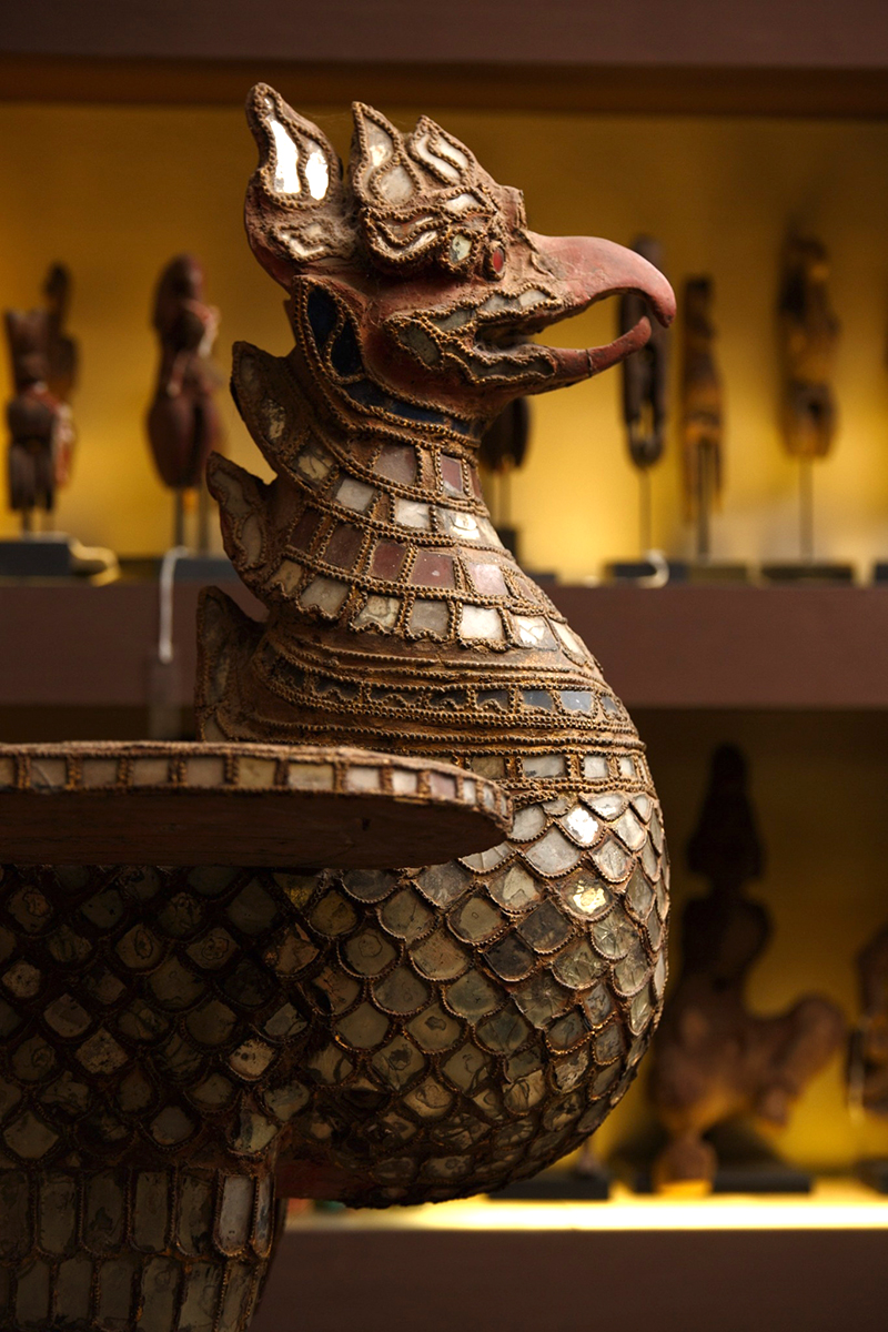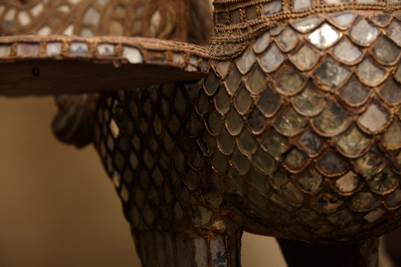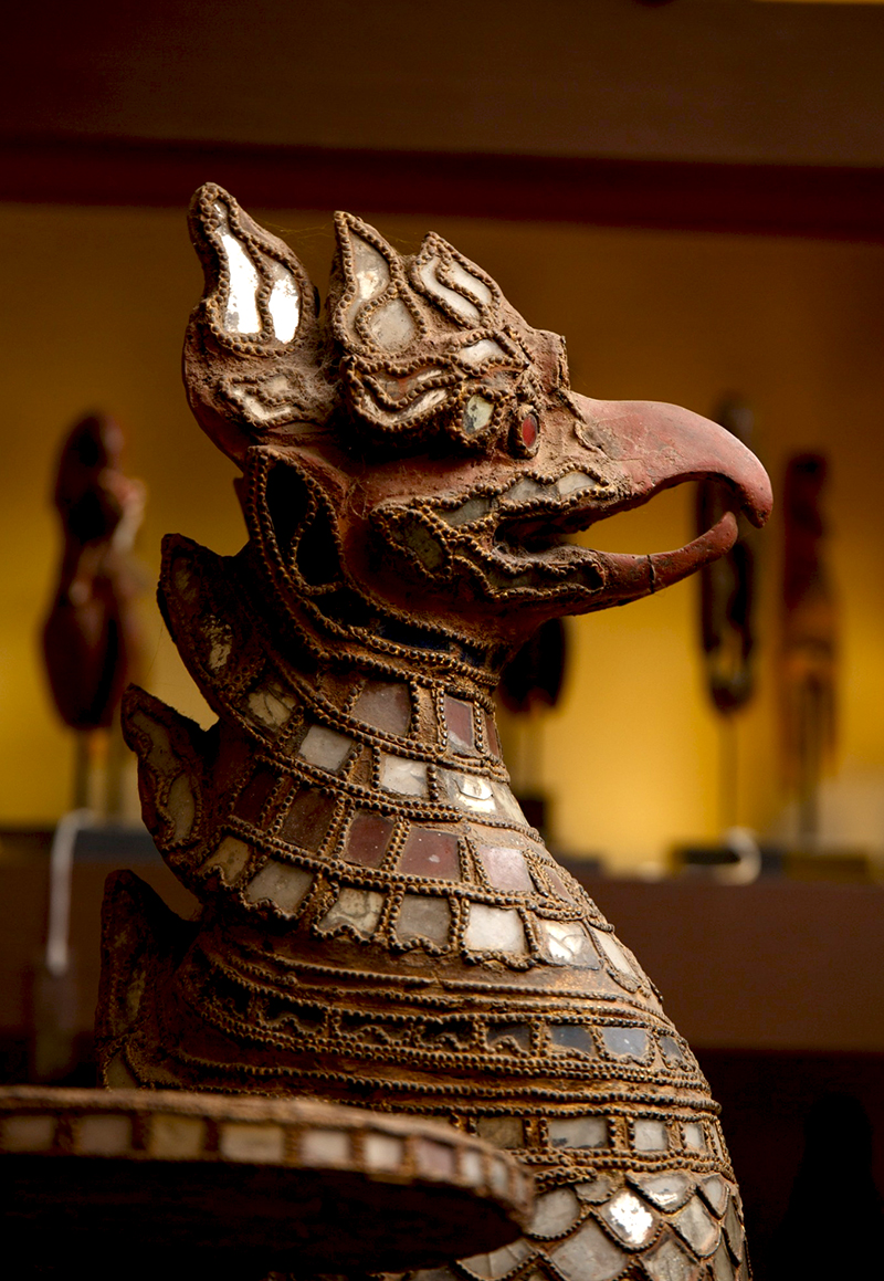 This opulent decoration is typical of the “Mandalay style”, popular during the Konbaung period (1752–1885). The sophistication of Burmese lacquerwork is on full display here. Ceremonial Hintha-bird vessel. Myanmar, Mandalay, late 19th century.