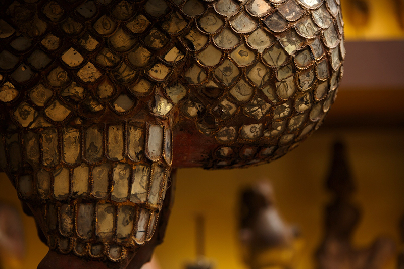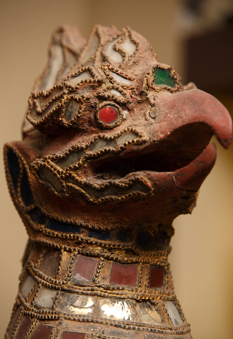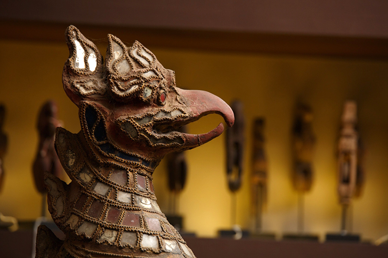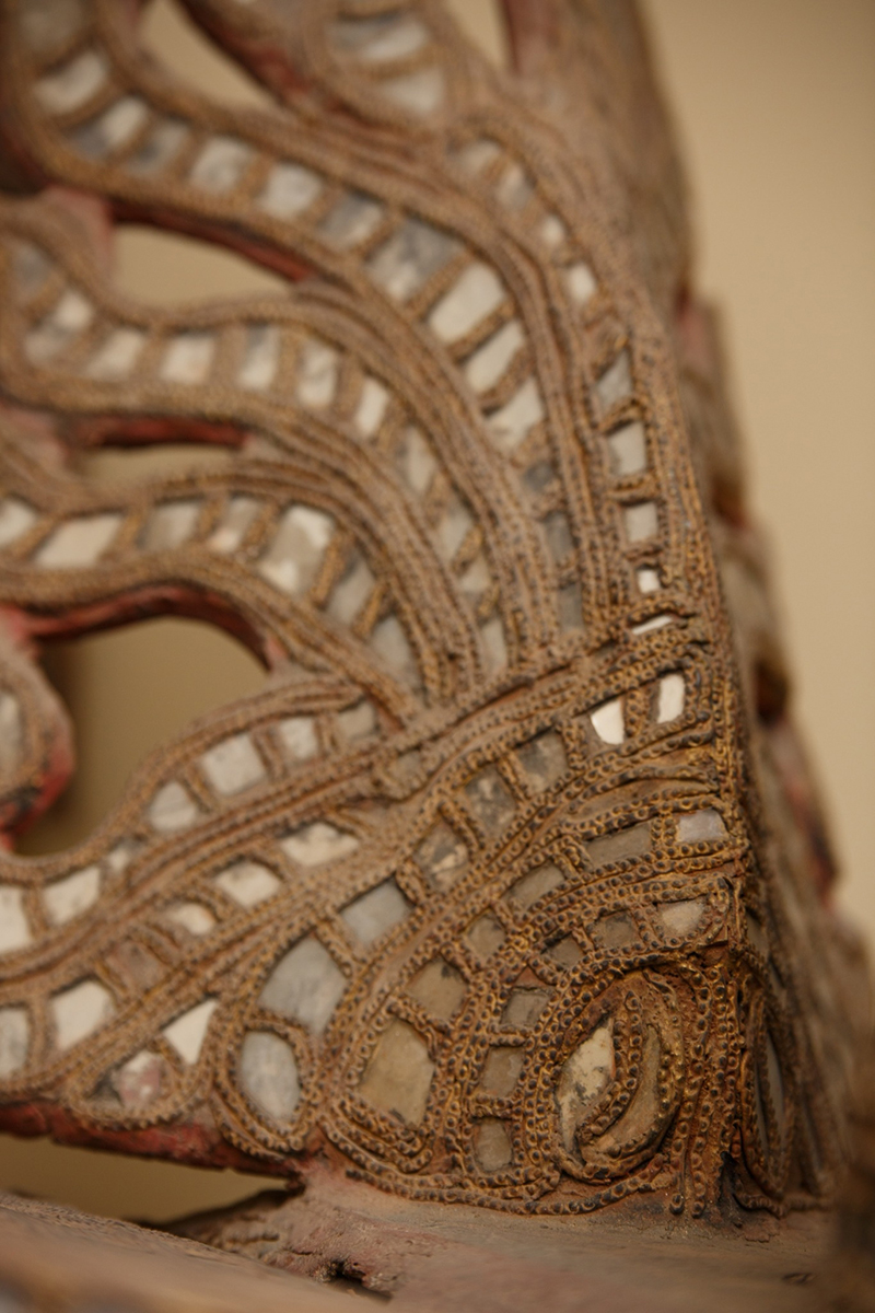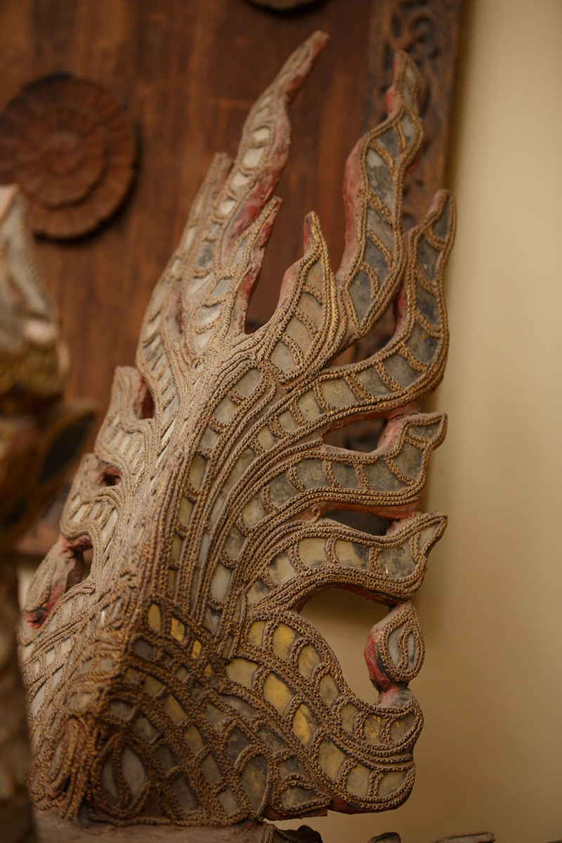 This opulent decoration is typical of the “Mandalay style”, popular during the Konbaung period (1752–1885). The sophistication of Burmese lacquerwork is on full display here. Ceremonial Hintha-bird vessel. Myanmar, Mandalay, late 19th century.